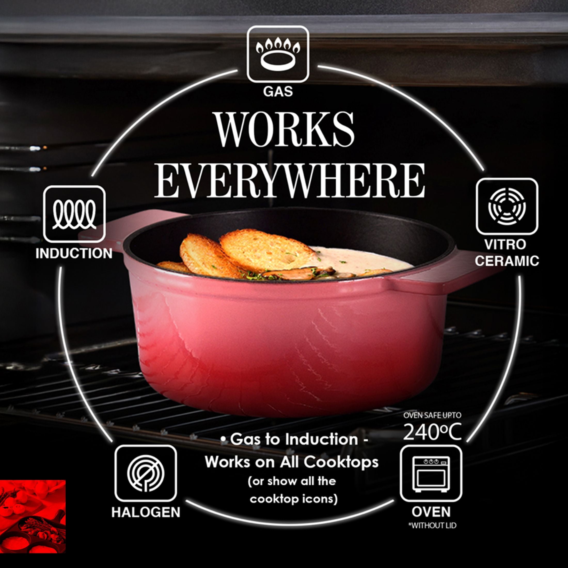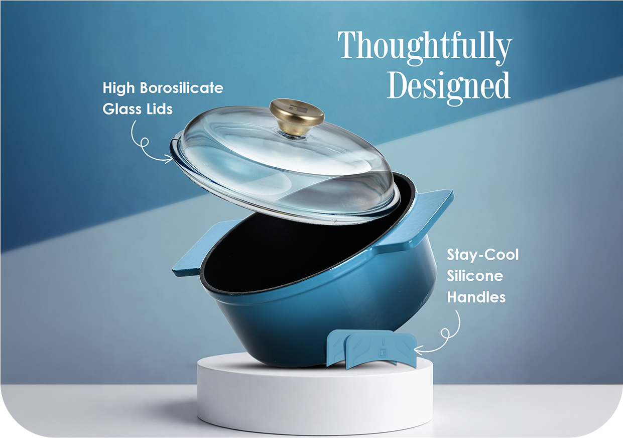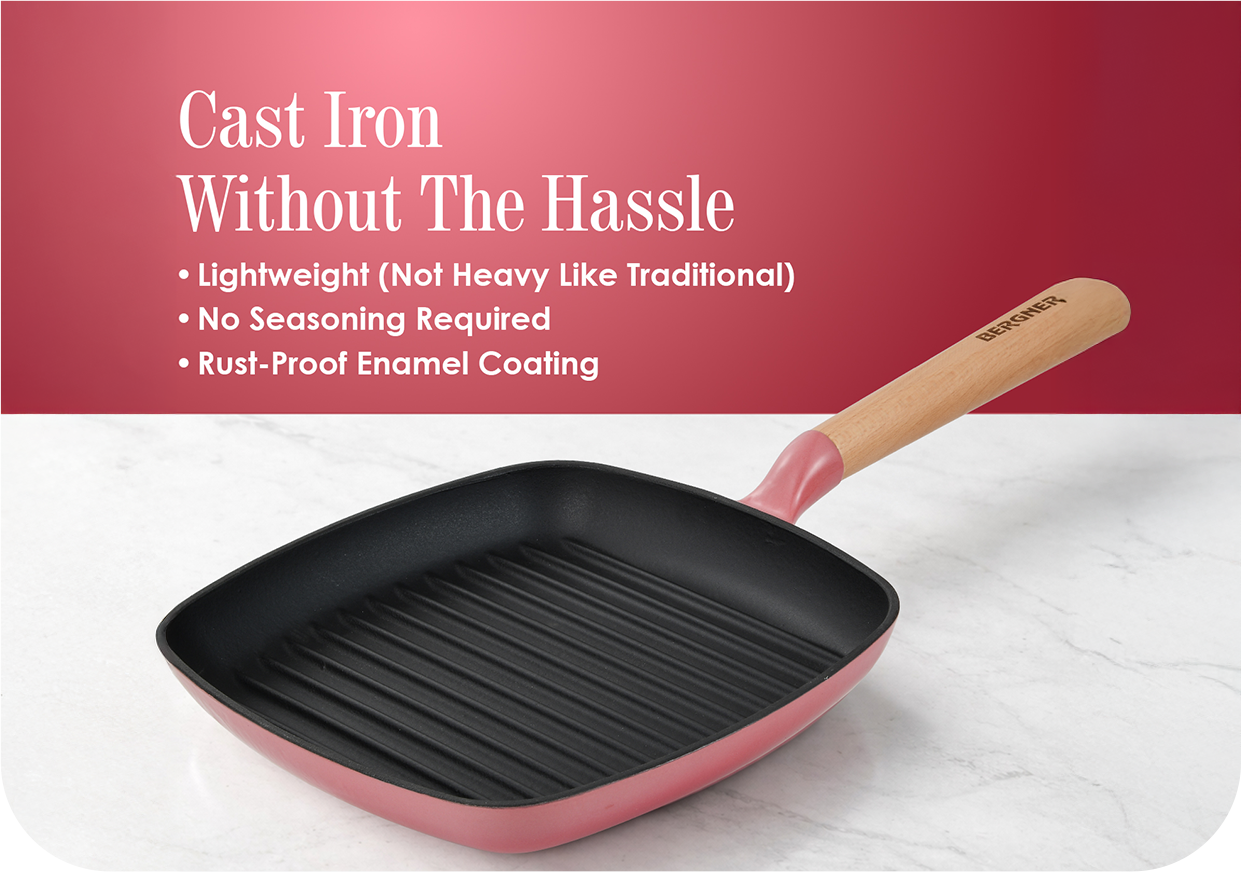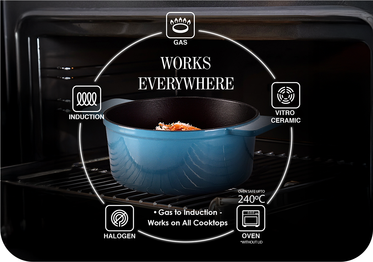 No seasoning required. The food-grade enamel coating is ready to use from day one and ensures effortless cooking and cleaning.