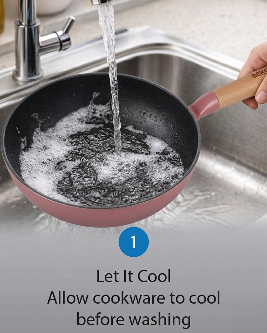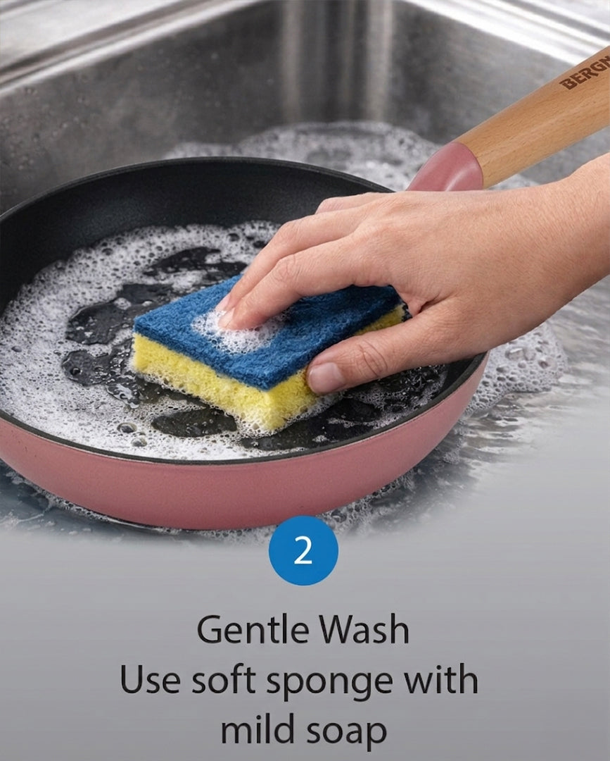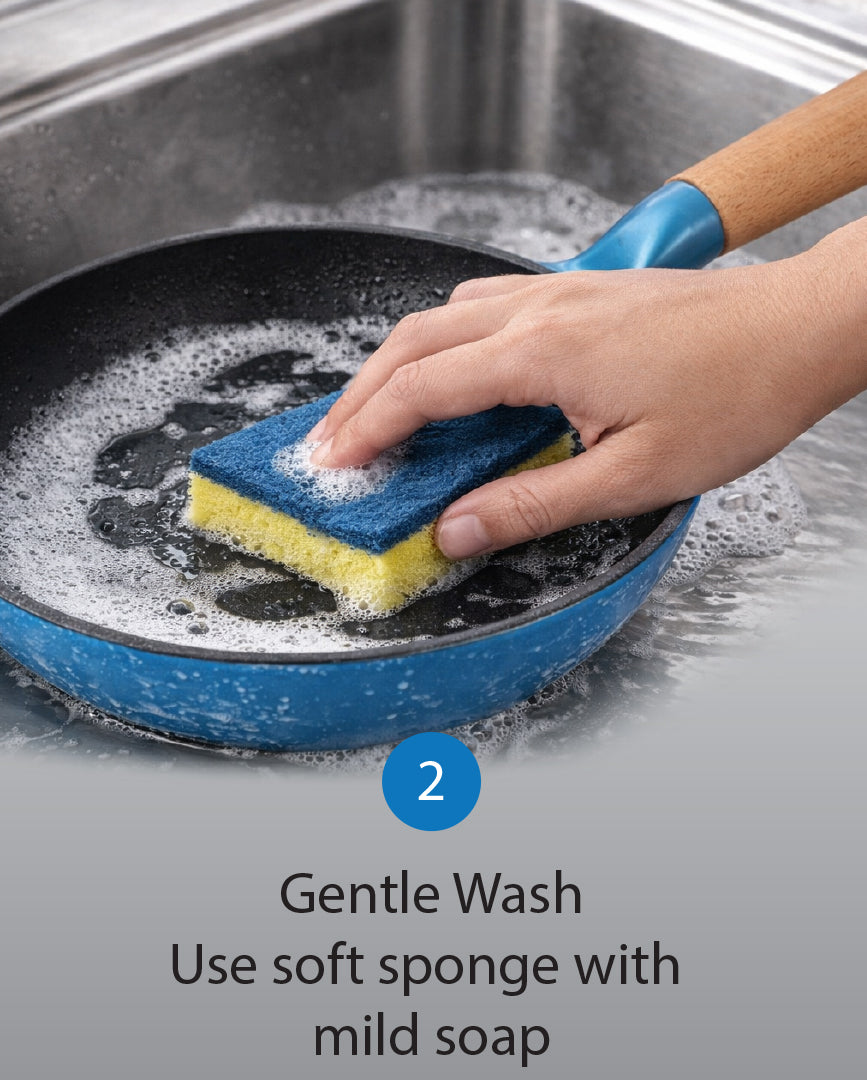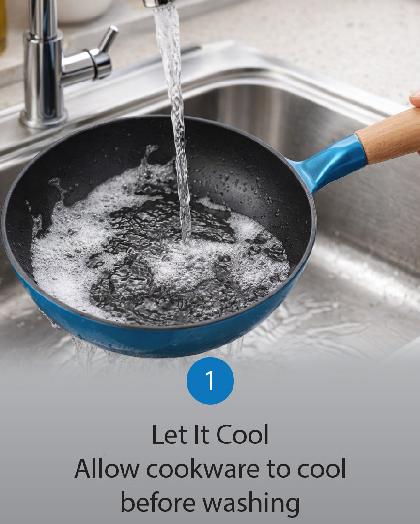Clean the cookware after it has cooled, using warm soapy water, then rinse and dry thoroughly. For stubborn residue, soak briefly and use a soft sponge. Avoid metal or harsh abrasives. Hand washing is recommended to maintain the enamel finish, and always store it dry.