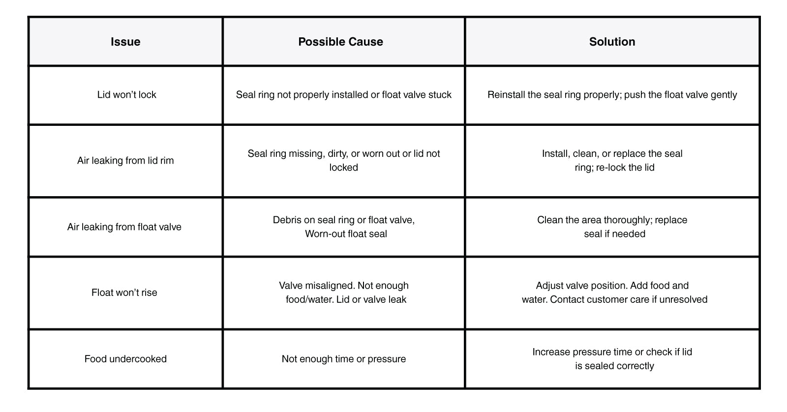- Never force open the lid under pressure. Wait for the float valve to drop.